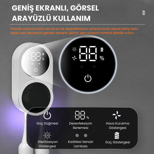 MeySteril™ UV Işıklı Duvara Monte Akıllı Diş Fırçası Sterilizatörü – Dijital Ekranlı ve Şarjlı Hijyen Cihazı
